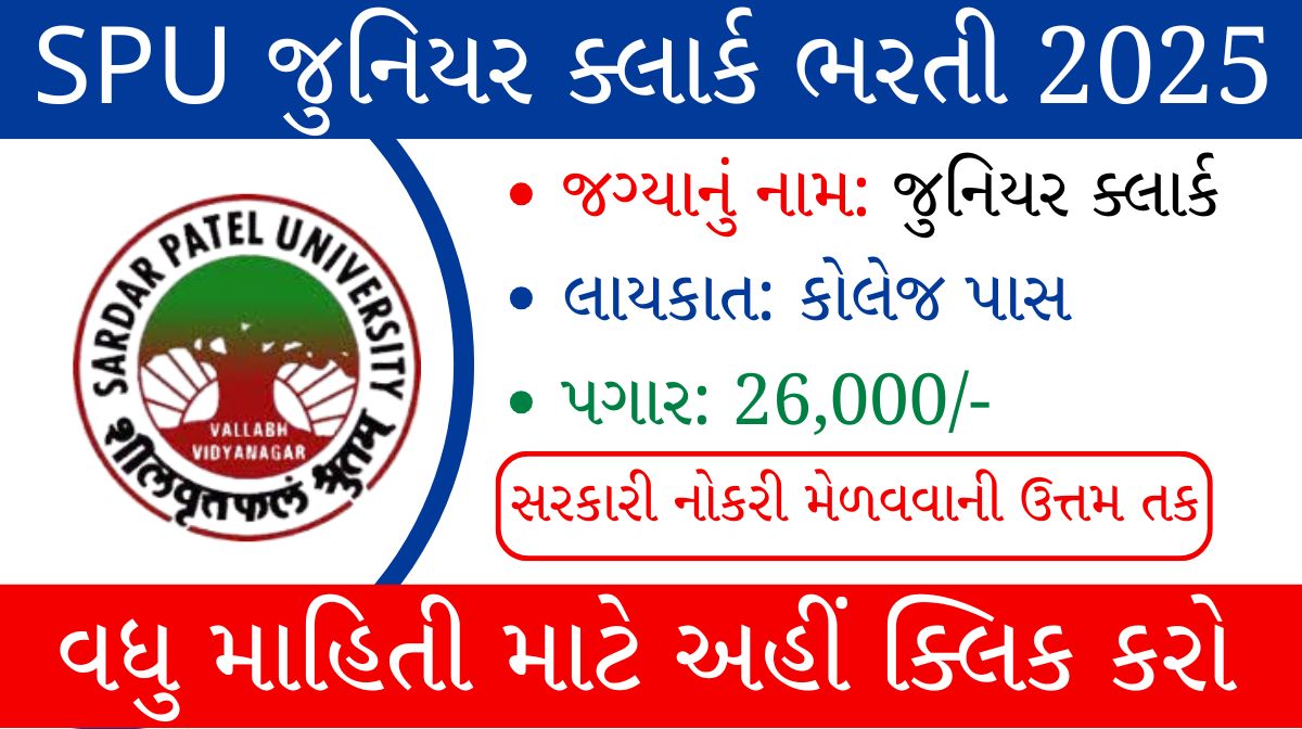કોલેજ પાસ માટે સરદાર પટેલ યુનિવર્સિટીમાં સીધી જુનિયર ક્લાર્ક ભરતી! પગાર, ₹26,000 – Junior Clerk Bharti 2025